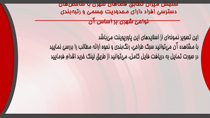 پاورپوینت کامل سنجش میزان تطابق فضاهای شهری با شاخصهای دسترسی افراد دارای محدودیت جسمی و رتبهبندی نواحی شهری بر اساس آن