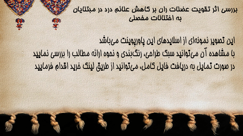 پاورپوینت کامل بررسی اثر تقویت عضلات ران بر کاهش علائم درد در مبتلایان به اختلالات مفصلی