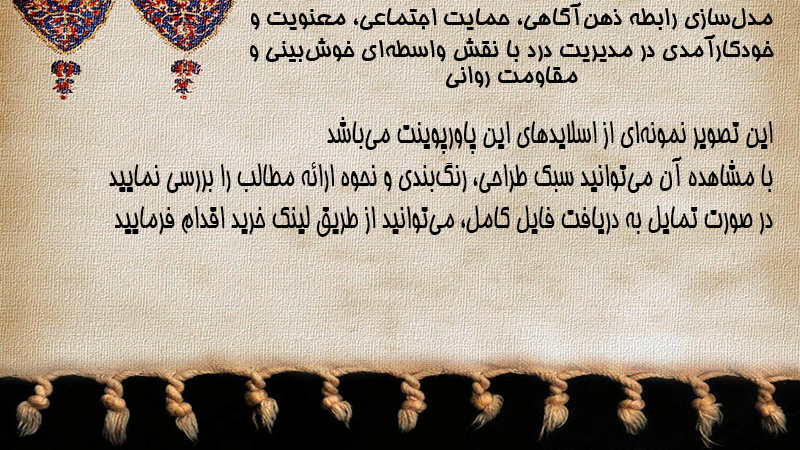 پاورپوینت کامل مدلسازی رابطه ذهنآگاهی، حمایت اجتماعی، معنویت و خودکارآمدی در مدیریت درد با نقش واسطهای خوشبینی و مقاومت روانی