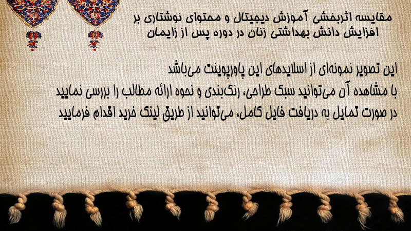 پاورپوینت کامل مقایسه اثربخشی آموزش دیجیتال و محتوای نوشتاری بر افزایش دانش بهداشتی زنان در دوره پس از زایمان
