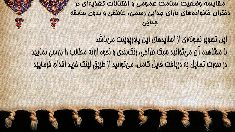 پاورپوینت کامل مقایسه وضعیت سلامت عمومی و اختلالات تغذیهای در دختران خانوادههای دارای جدایی رسمی، عاطفی و بدون سابقه جدایی