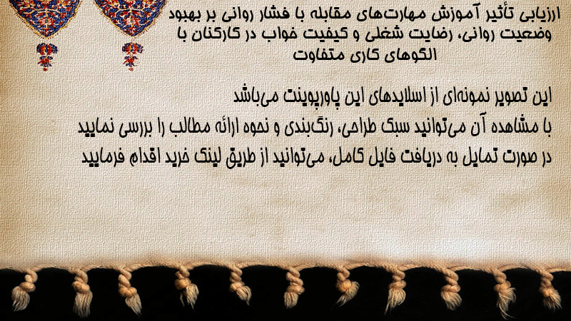 پاورپوینت کامل ارزیابی تأثیر آموزش مهارتهای مقابله با فشار روانی بر بهبود وضعیت روانی، رضایت شغلی و کیفیت خواب در کارکنان با الگوهای کاری متفاوت