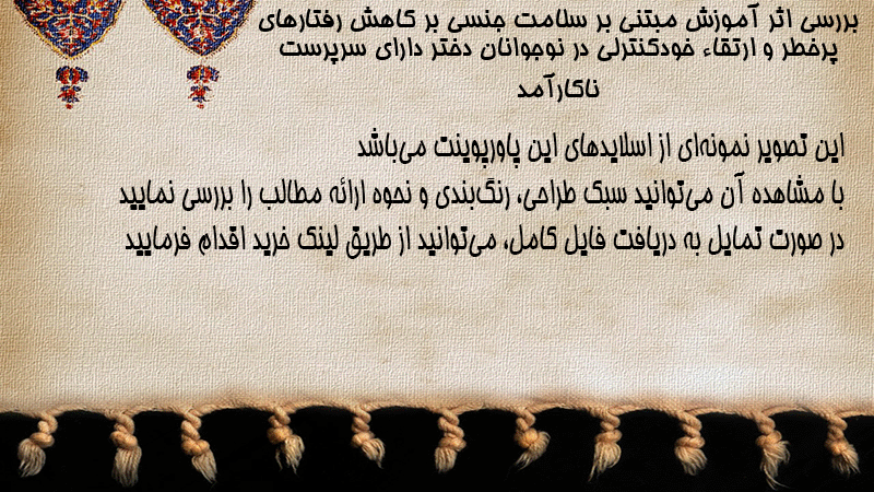 پاورپوینت کامل بررسی اثر آموزش مبتنی بر سلامت جنسی بر کاهش رفتارهای پرخطر و ارتقاء خودکنترلی در نوجوانان دختر دارای سرپرست ناکارآمد