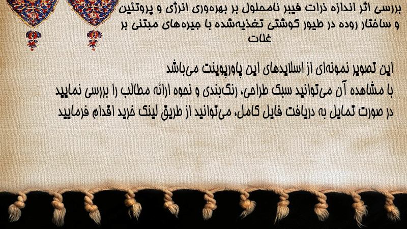 پاورپوینت کامل بررسی اثر اندازه ذرات فیبر نامحلول بر بهرهوری انرژی و پروتئین و ساختار روده در طیور گوشتی تغذیهشده با جیرههای مبتنی بر غلات