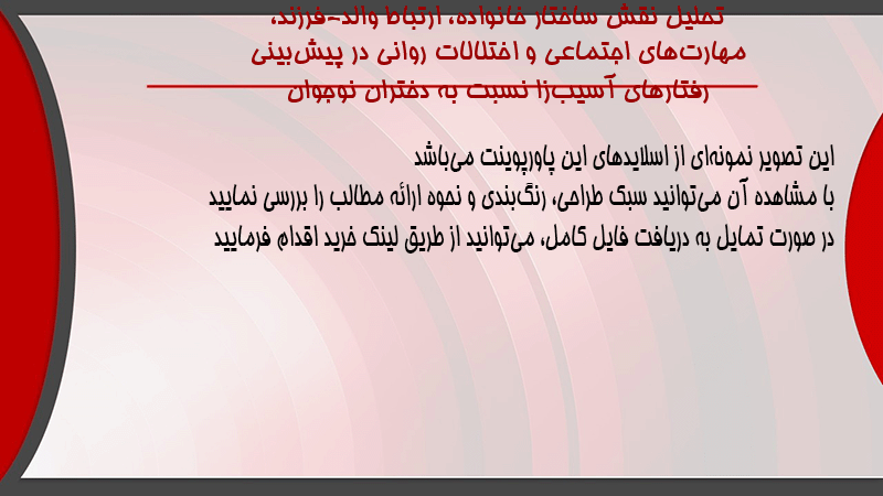 پاورپوینت کامل تحلیل نقش ساختار خانواده، ارتباط والد-فرزند، مهارتهای اجتماعی و اختلالات روانی در پیشبینی رفتارهای آسیبزا نسبت به دختران نوجوان