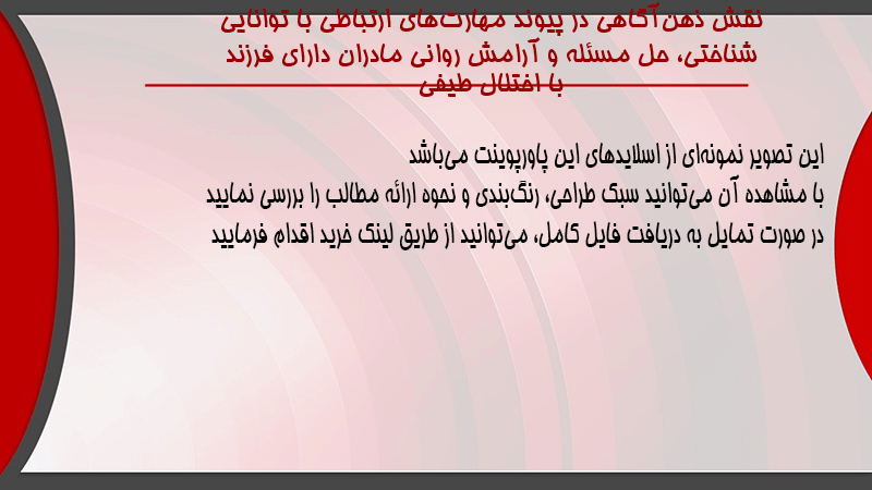 پاورپوینت کامل نقش ذهنآگاهی در پیوند مهارتهای ارتباطی با توانایی شناختی، حل مسئله و آرامش روانی مادران دارای فرزند با اختلال طیفی