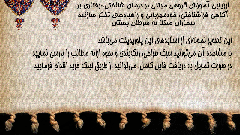 پاورپوینت کامل ارزیابی آموزش گروهی مبتنی بر درمان شناختی-رفتاری بر آگاهی فراشناختی، خودمهربانی و راهبردهای تفکر سازنده بیماران مبتلا به سرطان پستان