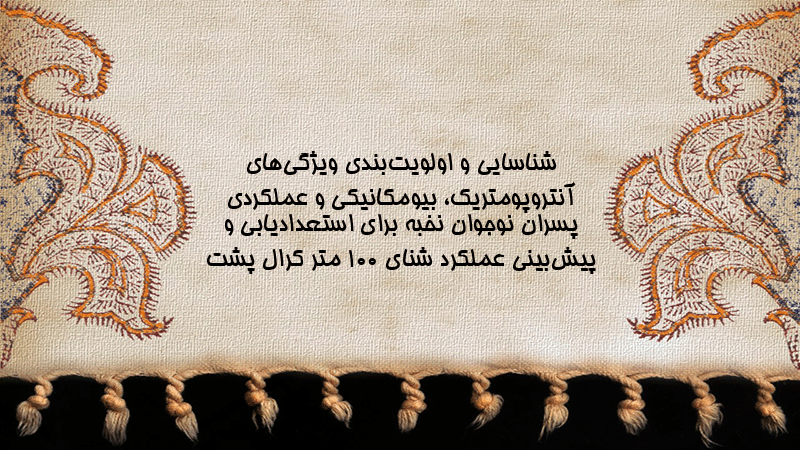 پاورپوینت کامل شناسایی و اولویتبندی ویژگیهای آنتروپومتریک، بیومکانیکی و عملکردی پسران نوجوان نخبه برای استعدادیابی و پیشبینی عملکرد شنای ۱۰۰ متر کرال پشت