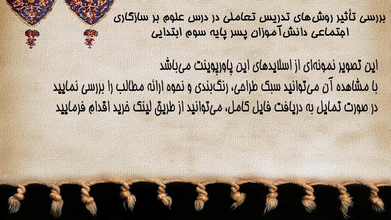 پاورپوینت کامل بررسی تأثیر روشهای تدریس تعاملی در درس علوم بر سازگاری اجتماعی دانشآموزان پسر پایه سوم ابتدایی