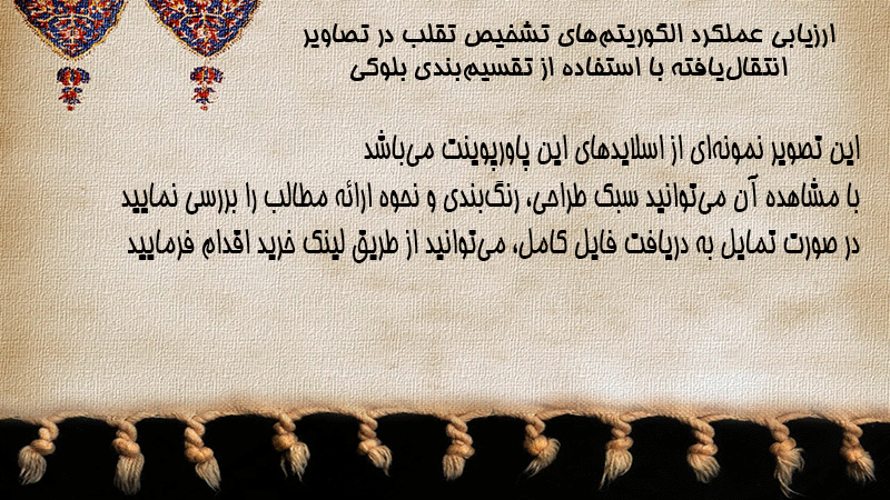 پاورپوینت کامل ارزیابی عملکرد الگوریتمهای تشخیص تقلب در تصاویر انتقالیافته با استفاده از تقسیمبندی بلوکی