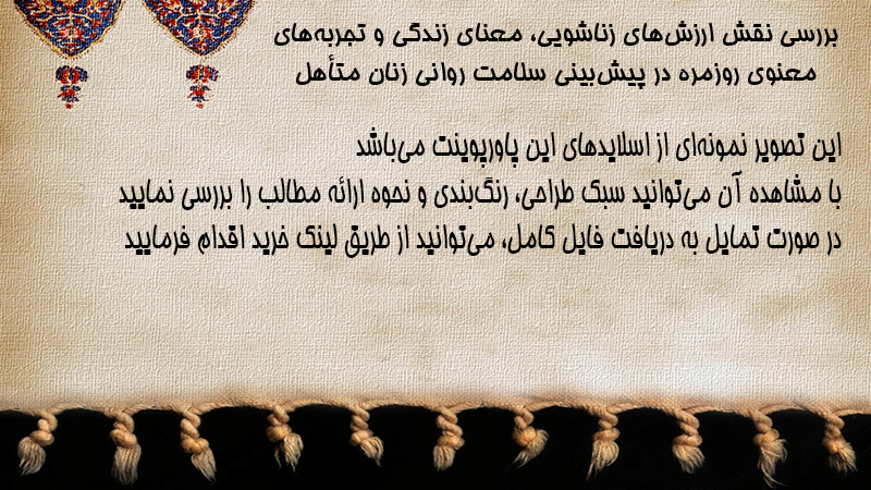 پاورپوینت کامل بررسی نقش ارزشهای زناشویی، معنای زندگی و تجربههای معنوی روزمره در پیشبینی سلامت روانی زنان متأهل