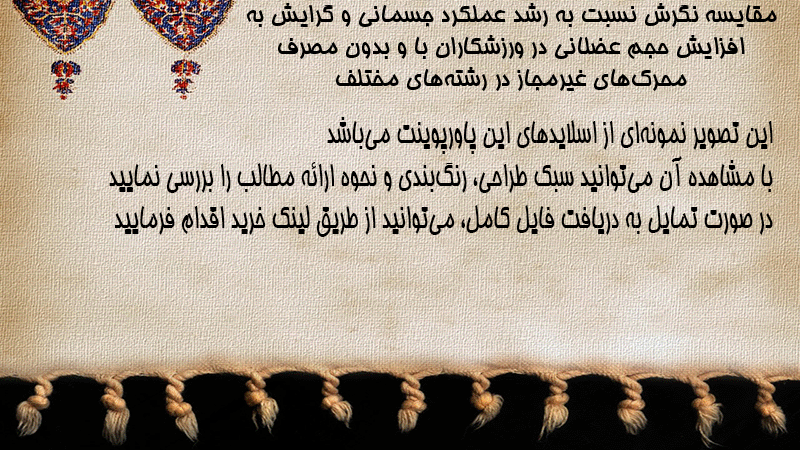 پاورپوینت کامل مقایسه نگرش نسبت به رشد عملکرد جسمانی و گرایش به افزایش حجم عضلانی در ورزشکاران با و بدون مصرف محرکهای غیرمجاز در رشتههای مختلف