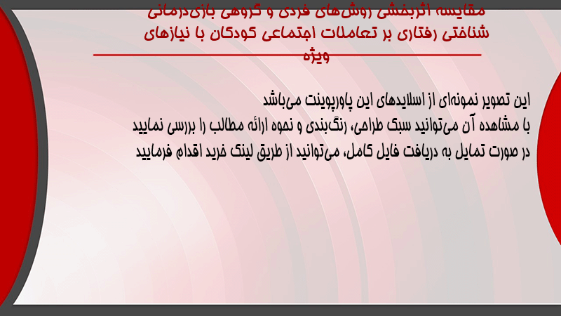 پاورپوینت کامل مقایسه اثربخشی روشهای فردی و گروهی بازیدرمانی شناختی رفتاری بر تعاملات اجتماعی کودکان با نیازهای ویژه