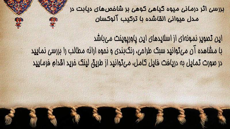 پاورپوینت کامل بررسی اثر درمانی میوه گیاهی کوهی بر شاخصهای دیابت در مدل حیوانی القاشده با ترکیب آلوکسان
