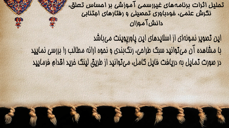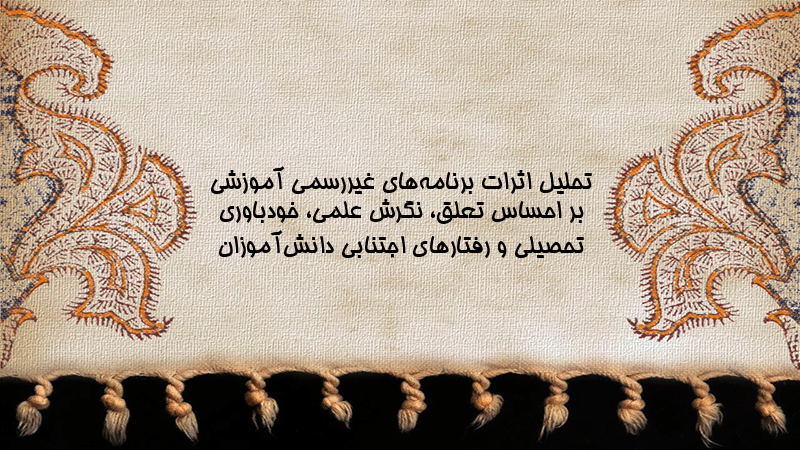پاورپوینت کامل تحلیل اثرات برنامههای غیررسمی آموزشی بر احساس تعلق، نگرش علمی، خودباوری تحصیلی و رفتارهای اجتنابی دانشآموزان