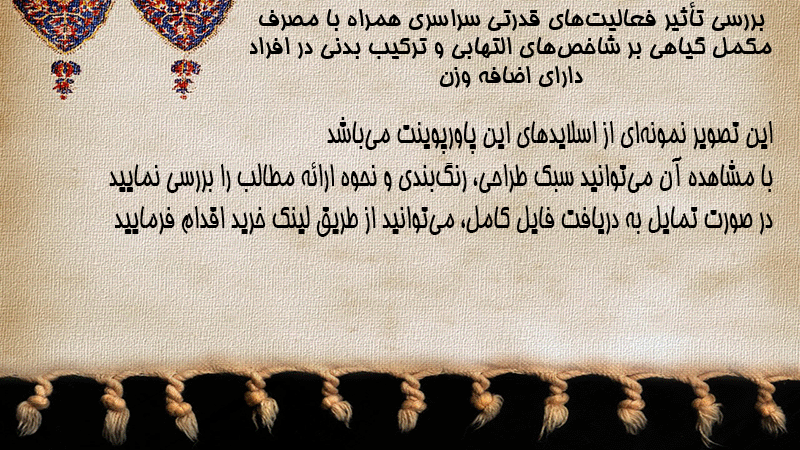 پاورپوینت کامل بررسی تأثیر فعالیتهای قدرتی سراسری همراه با مصرف مکمل گیاهی بر شاخصهای التهابی و ترکیب بدنی در افراد دارای اضافه وزن