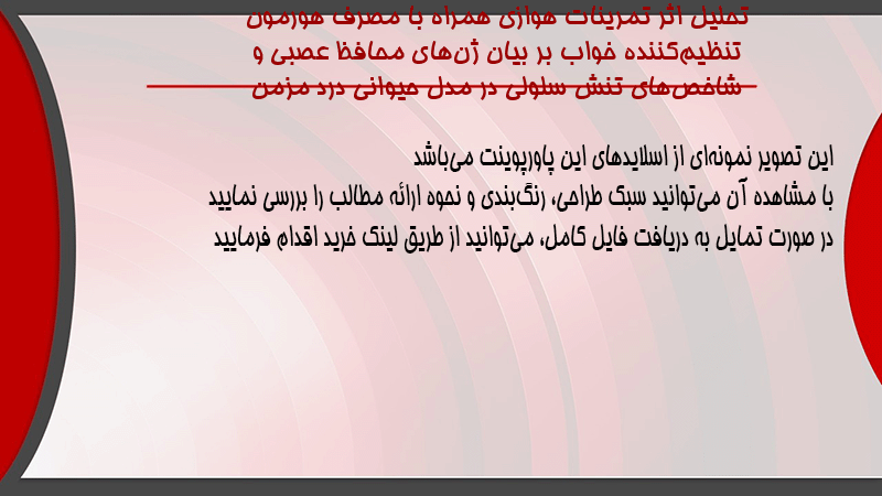 پاورپوینت کامل تحلیل اثر تمرینات هوازی همراه با مصرف هورمون تنظیمکننده خواب بر بیان ژنهای محافظ عصبی و شاخصهای تنش سلولی در مدل حیوانی درد مزمن