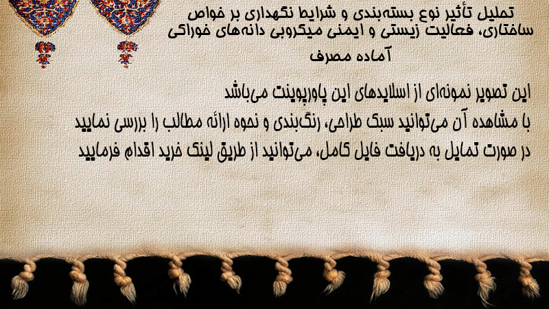 پاورپوینت کامل تحلیل تأثیر نوع بستهبندی و شرایط نگهداری بر خواص ساختاری، فعالیت زیستی و ایمنی میکروبی دانههای خوراکی آماده مصرف