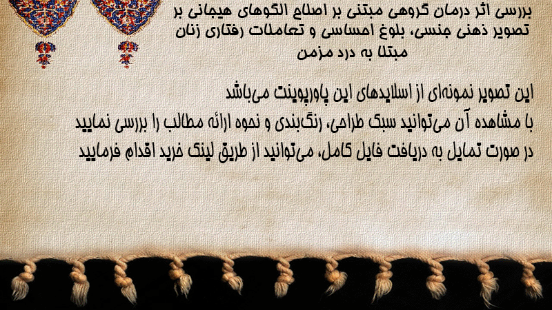 پاورپوینت کامل بررسی اثر درمان گروهی مبتنی بر اصلاح الگوهای هیجانی بر تصویر ذهنی جنسی، بلوغ احساسی و تعاملات رفتاری زنان مبتلا به درد مزمن