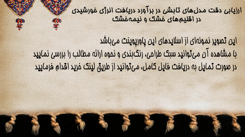 پاورپوینت کامل ارزیابی دقت مدلهای تابشی در برآورد دریافت انرژی خورشیدی در اقلیمهای خشک و نیمهخشک
