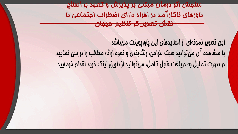 پاورپوینت کامل سنجش اثر درمان مبتنی بر پذیرش و تعهد بر اصلاح باورهای ناکارآمد در افراد دارای اضطراب اجتماعی با نقش تعدیلگر تنظیم هیجان
