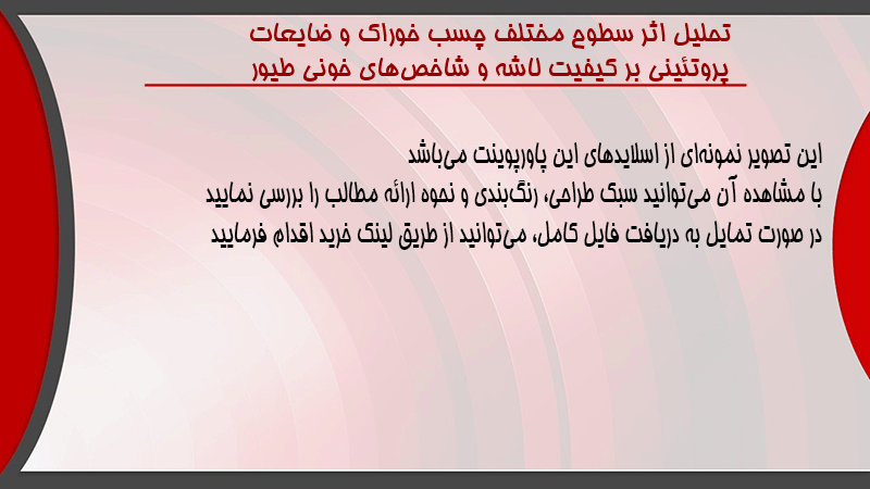پاورپوینت کامل تحلیل اثر سطوح مختلف چسب خوراک و ضایعات پروتئینی بر کیفیت لاشه و شاخصهای خونی طیور