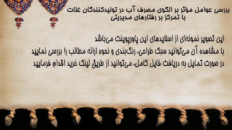 پاورپوینت کامل بررسی عوامل مؤثر بر الگوی مصرف آب در تولیدکنندگان غلات با تمرکز بر رفتارهای مدیریتی