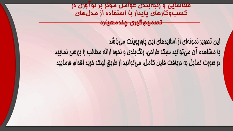 پاورپوینت کامل شناسایی و رتبهبندی عوامل مؤثر بر نوآوری در کسبوکارهای پایدار با استفاده از مدلهای تصمیمگیری چندمعیاره