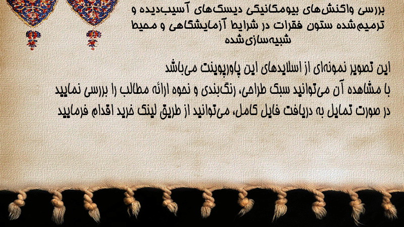 پاورپوینت کامل بررسی واکنشهای بیومکانیکی دیسکهای آسیبدیده و ترمیمشده ستون فقرات در شرایط آزمایشگاهی و محیط شبیهسازیشده