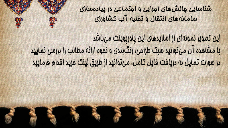 پاورپوینت کامل شناسایی چالشهای اجرایی و اجتماعی در پیادهسازی سامانههای انتقال و تخلیه آب کشاورزی